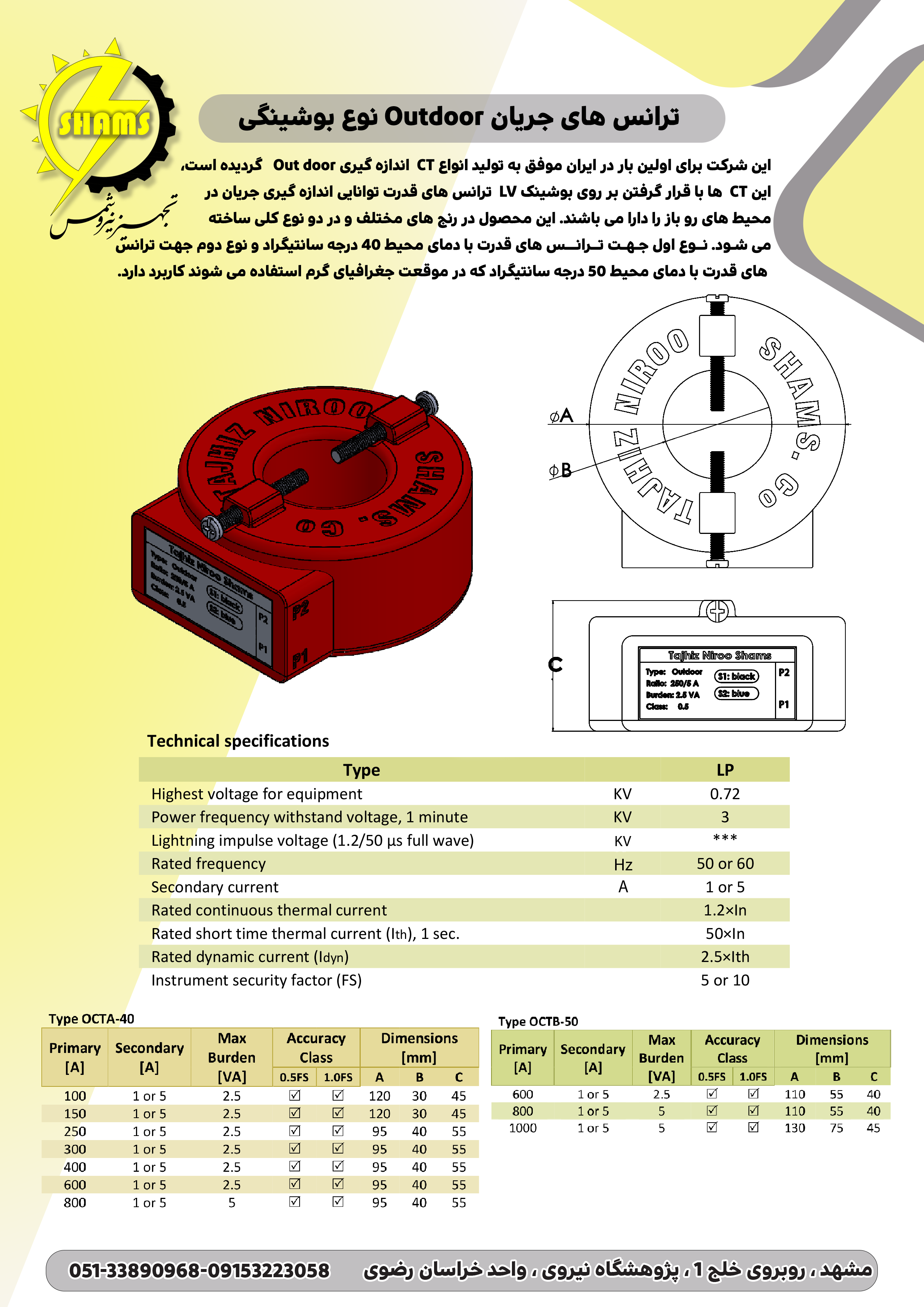 این شرکت برای اولین بار در ایران موفق به تولید انواع ترانس های جریان بوشینگی گردیده است ، این ct ها با نصب بر روی بوشینگ ترانس های قدرت توانایی اندازه گیری جریان در محیط رو باز را دارا می باشند.